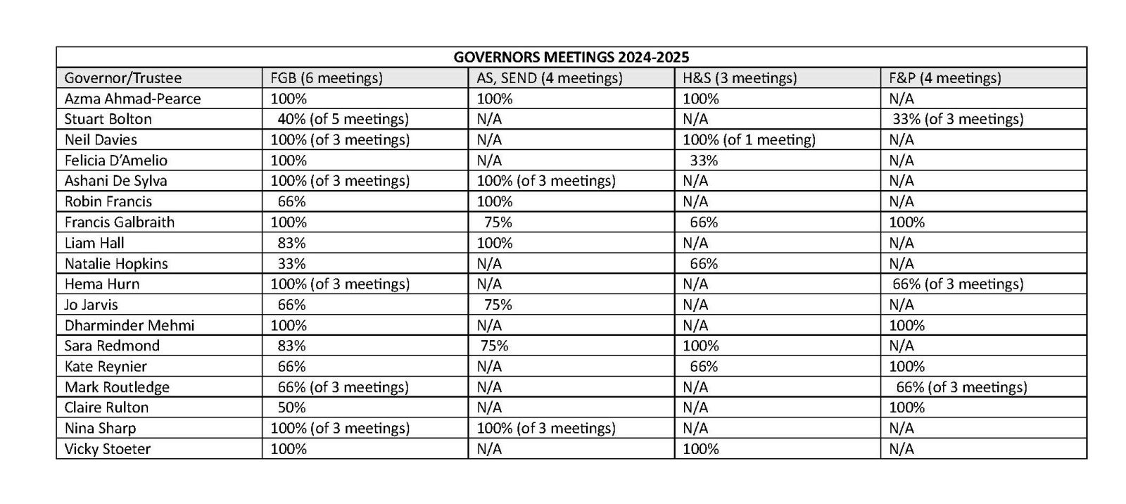Previous Governing Body Meetings and Attendance Records
