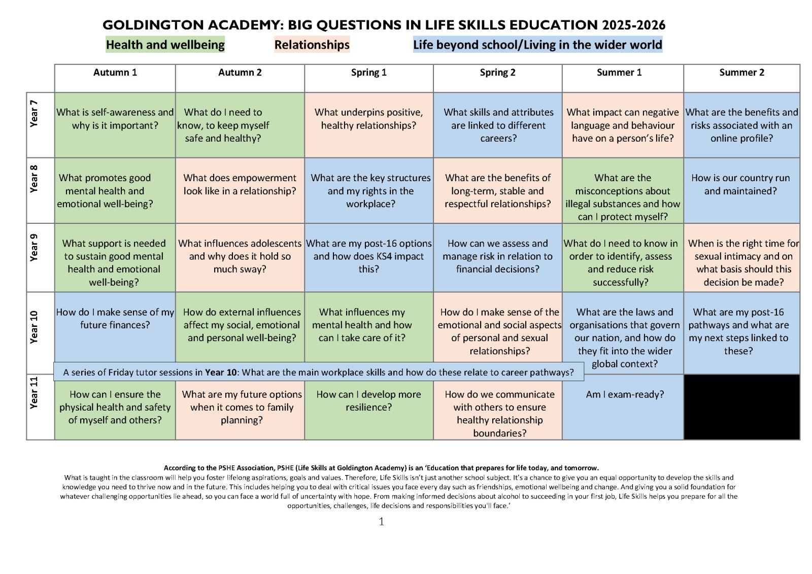 Every student at Goldington Academy studies life skills for one session per week, taught within their form group by their form tutor. Life Skills incorporates Personal, Social and Health Education (PSHE), Relationships Education, Relationships and Sex Education (RSE), Health Education (HE), Citizenship, and aspects of our Careers programme through Careers Education, Information and Guidance (CEIAG). We follow the PSHE Association’s thematic approach to cover content in an age-appropriate way.