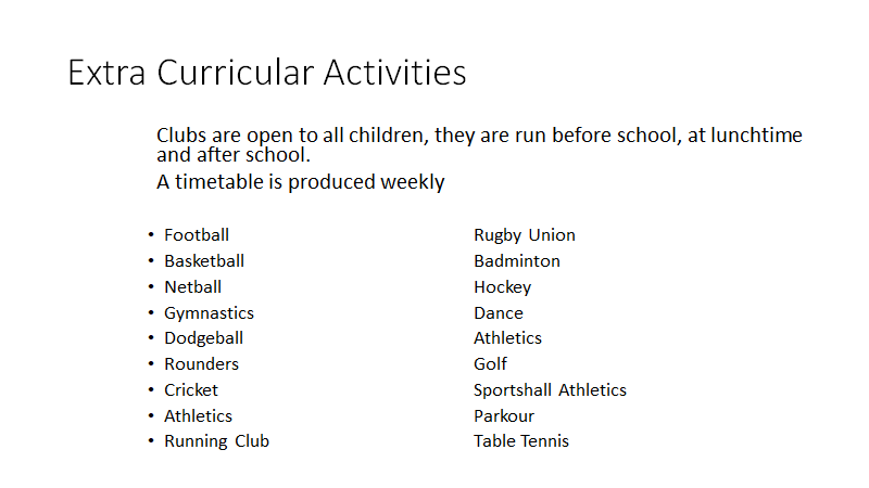 To provide opportunities for all students to participate in competitive and non-competitive activities, both during curriculum time and through extra-curricular clubs.